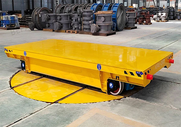 Trackless transfer cart uses the battery as the power source, and the solid rubberized wheels walk directly on the ground. The operation of the trackless transfer cart is not restricted, and it can turn 360° in situ to adapt to the operation in a narrow space. The imported wheels are wear-resistant while ensuring that the ground is not damaged.