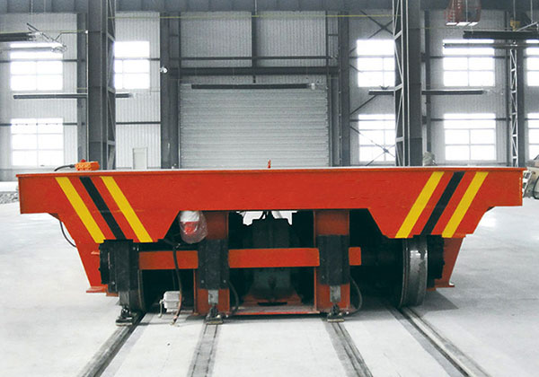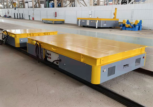 Low voltage rail powered transfer cart is a 36V single-phase or three-phase low-voltage track-powered electric transfer cart. The ground step-down transformer control cabinet steps down the single-phase (three-phase) 380V to single-phase (three-phase) 36V, feeds it to the electric flat cart through the track trolley line, and then boosts it to single-phase (three-phase) 380V through the on-board step-up transformer. This type of electric transfer cart has high requirements for track construction, and track insulation must be ensured. When exceeding a certain running distance, copper compensation lines should be added to the track. When the running distance is too long, the number of step-down transformers should be increased.